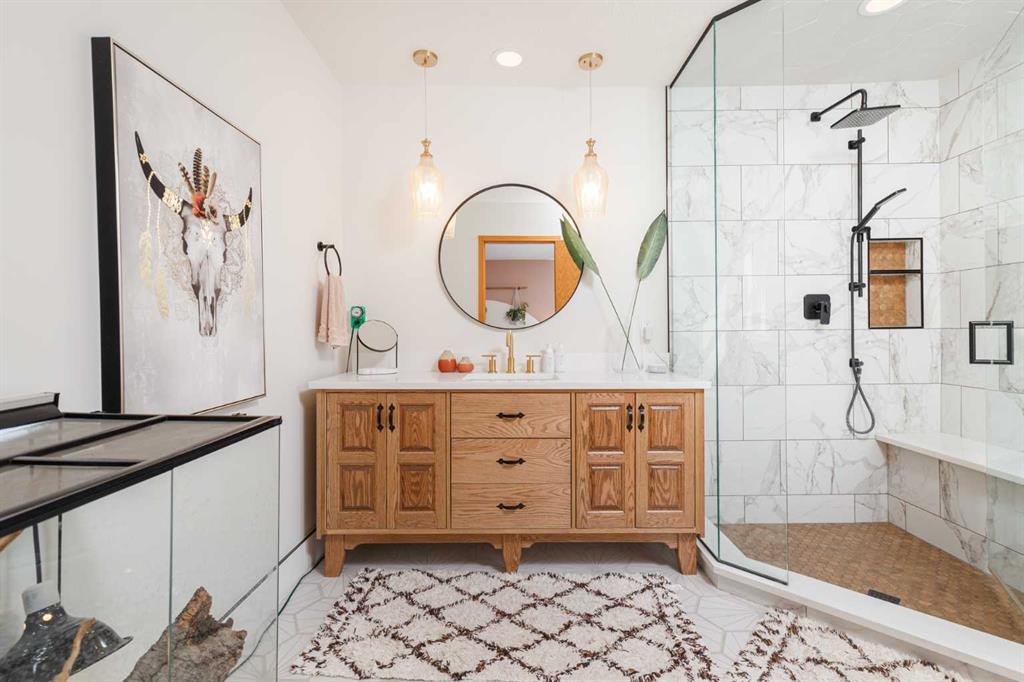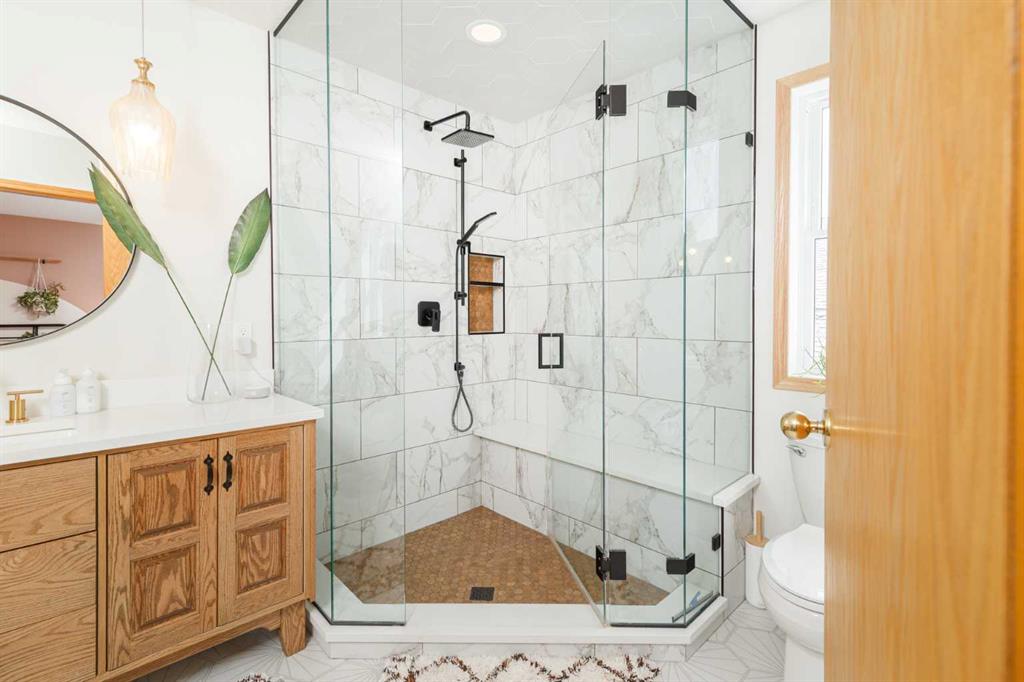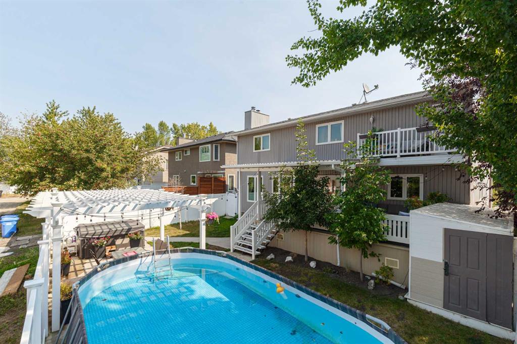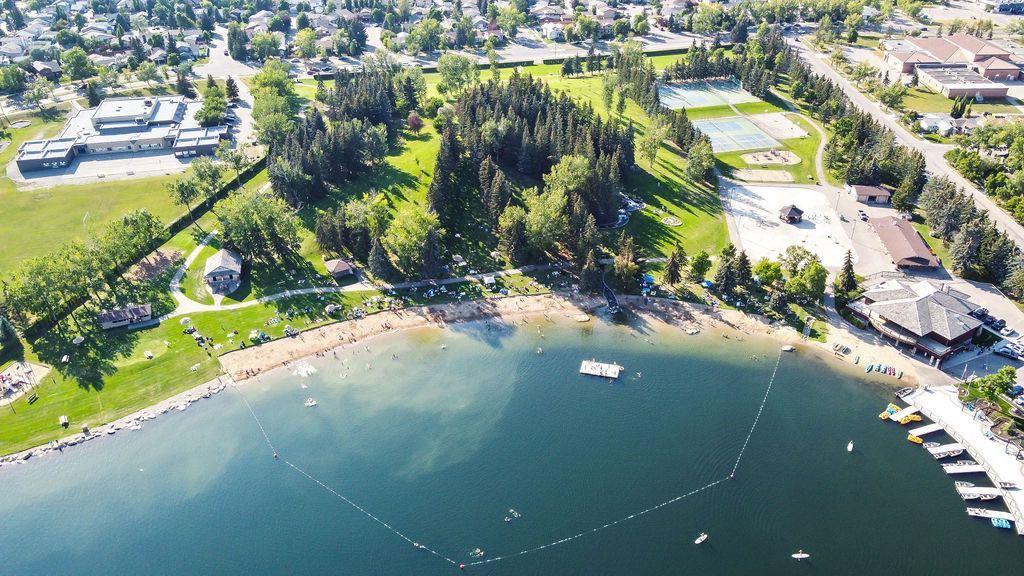 Upstairs, a sprawling primary bedroom awaits, featuring a private balcony and newly renovated ensuite boasting a glassed-in shower. Two spacious bedrooms, one graced with a jetted tub ensuite, and an additional full bathroom offer abundant accommodations. The fully finished basement introduces a second kitchen, a family room featuring a gas fireplace, 2 bedrooms including another primary suite, and a 4-piece bathroom. The illegal suite is complemented by a separate backyard entrance and private laundry amenities. Enjoy the comfort of air conditioning, a 20 ft above-ground pool, triple-pane windows, and a host of upgrades. Close to schools, shopping, and outdoor attractions, this home harmoniously encapsulates lakeside living with a lucrative income-generating potential.
